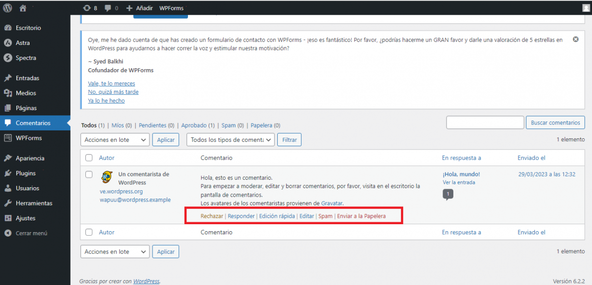 In this section you will see all the comments entered on your website in chronological order. Below the content of each comment, you'll see a menu where you can approve, reply to, or mark each entry as spam, among other actions, at your discretion.