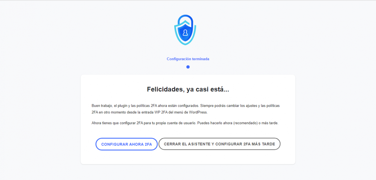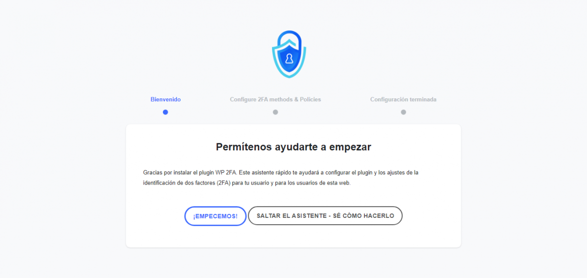 Click on the button LET'S START! to continue with the wizard. Afterwards, the wizard will indicate the configuration options that are active by default and you can deactivate any of them if you like, since you can modify the configuration whenever you want through the plugin.