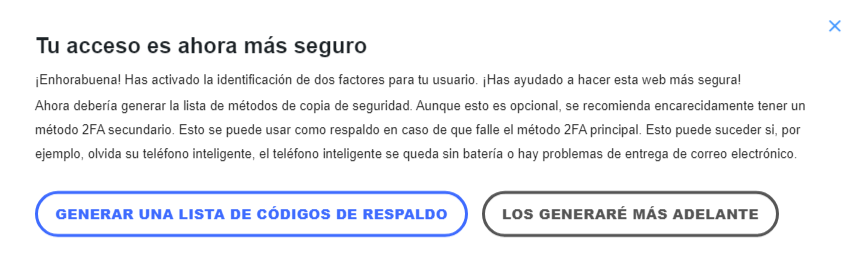 The wizard will then indicate that the generation of security codes is established as an alternative method. This is in case the user cannot access their phone or there are problems with the delivery of mail.