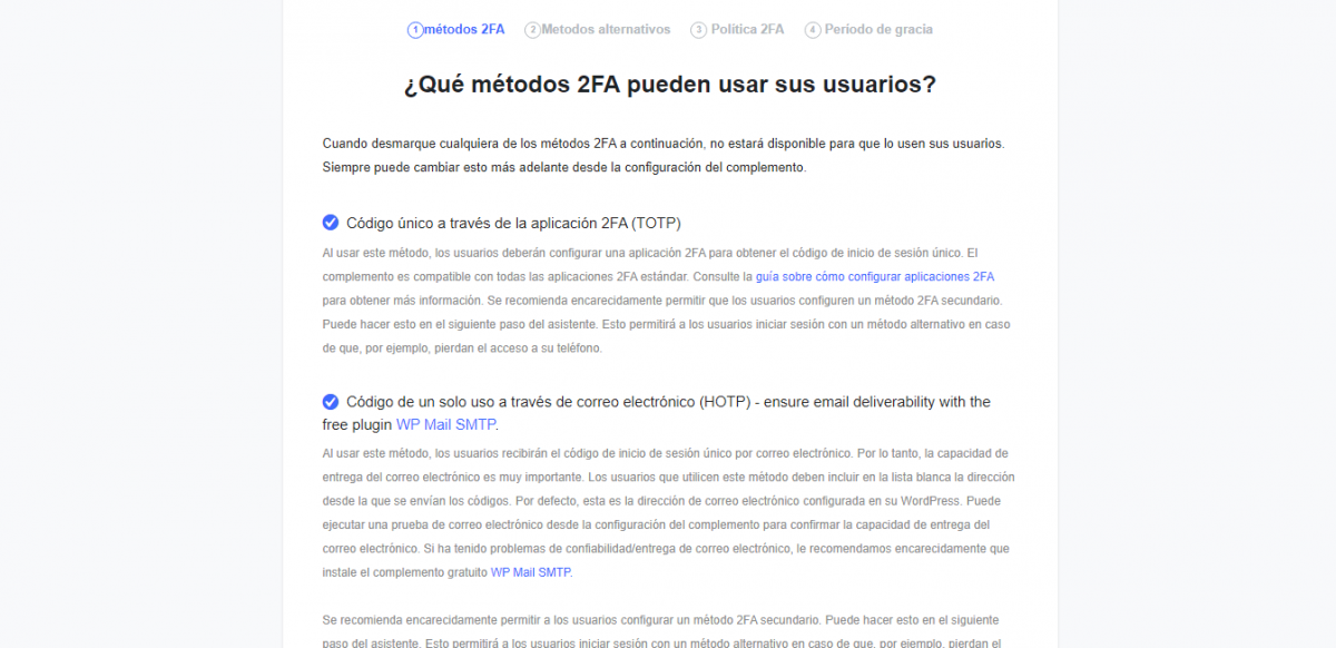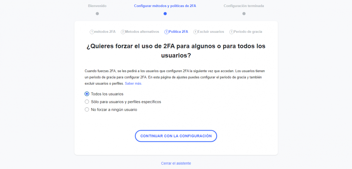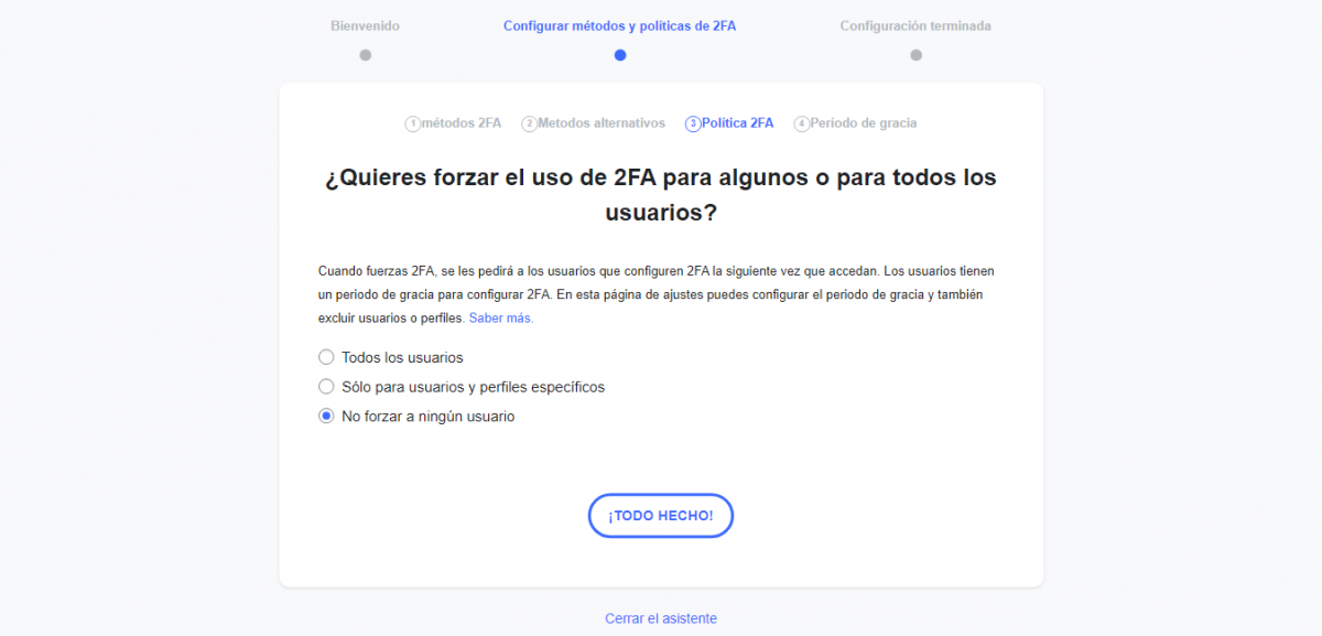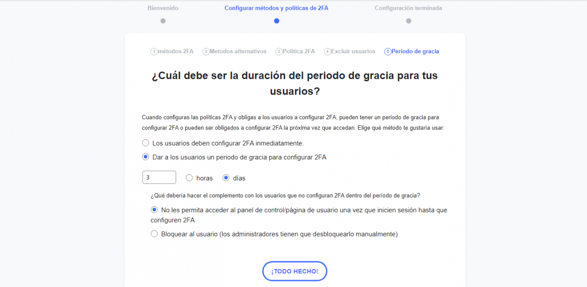 Finally, you will be able to define if users will have to configure the method immediately or if you will grant a maximum period for individual implementation and what actions should be taken in case the method is not activated.