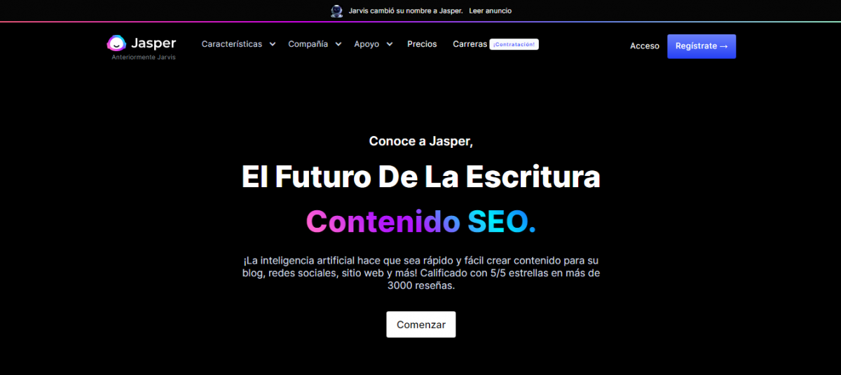 Jasper, formerly called Jarvis, is one of the most recognized SEO text development software today. It is available in more than 25 languages and creates completely original content in a few seconds.