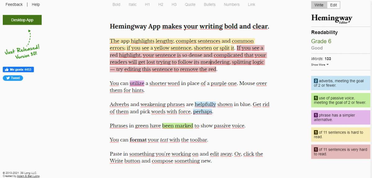 It is a grammar, spelling and style checker that will help you detect incorrect or unattractive forms of writing. Just by replacing the central text, the software will identify misused adverbs, passive forms that make it difficult to understand the text, phrases that can be replaced, among others.