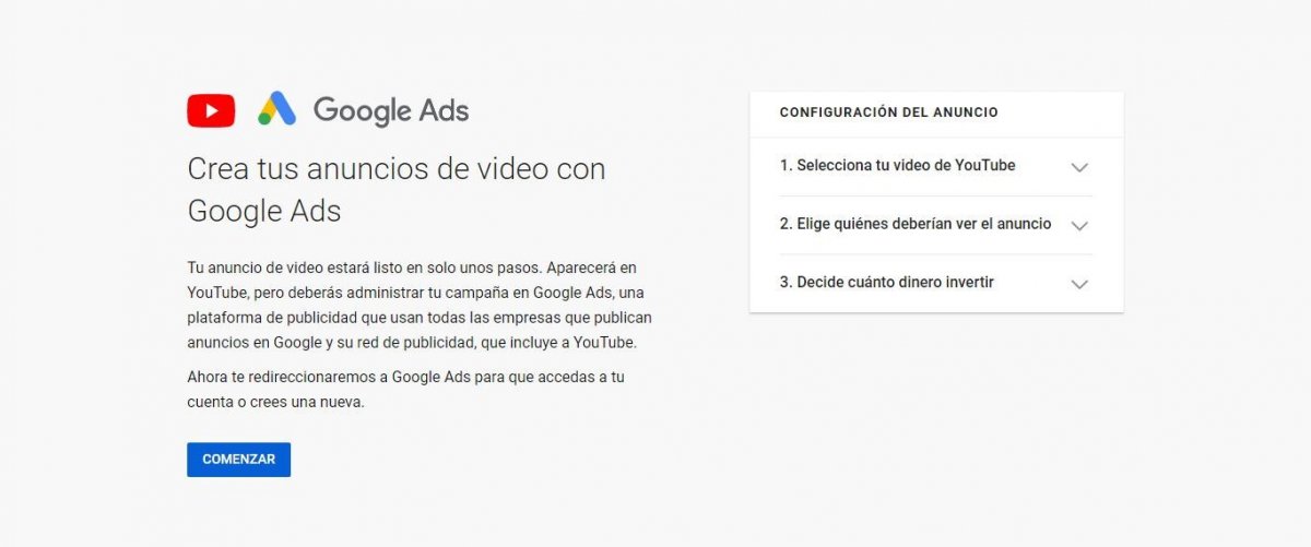 For this, it is necessary to have the video of your ad stored in your YouTube account or upload it at this time. Once you place the URL or upload it, indicate the ad format, that is, if it is In-Streaming, Discovery and Bumper.