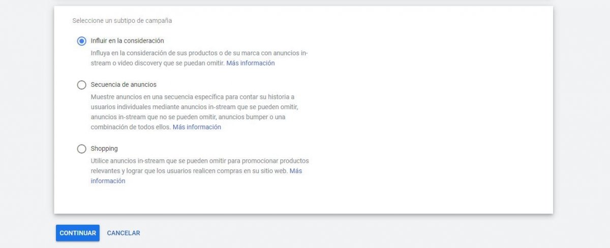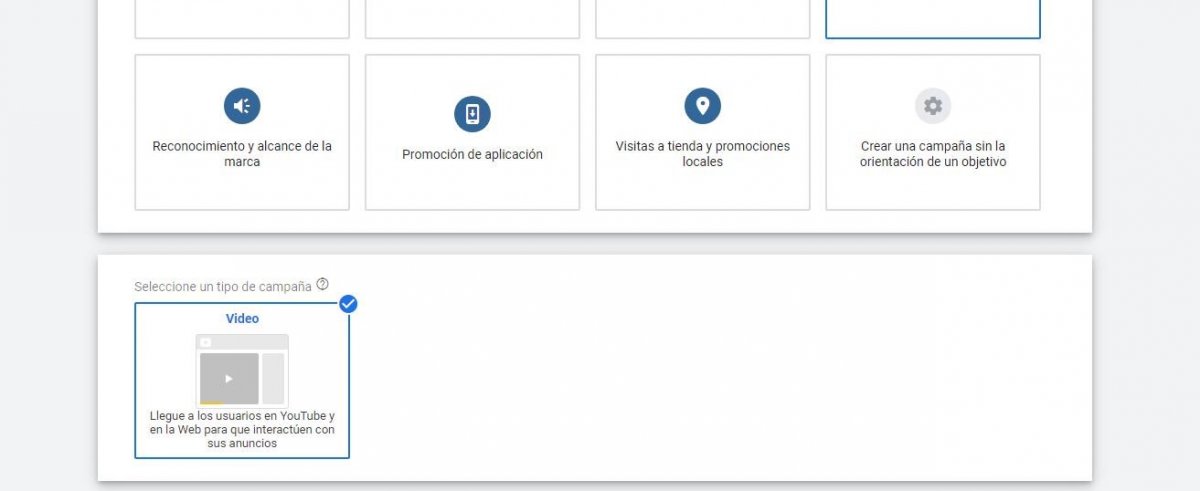 If you do a pan for each of the options, you will notice that not all of them have "Video" as a type of campaign that can be used. Select the one that best suits what you want to do, among those that include this format.