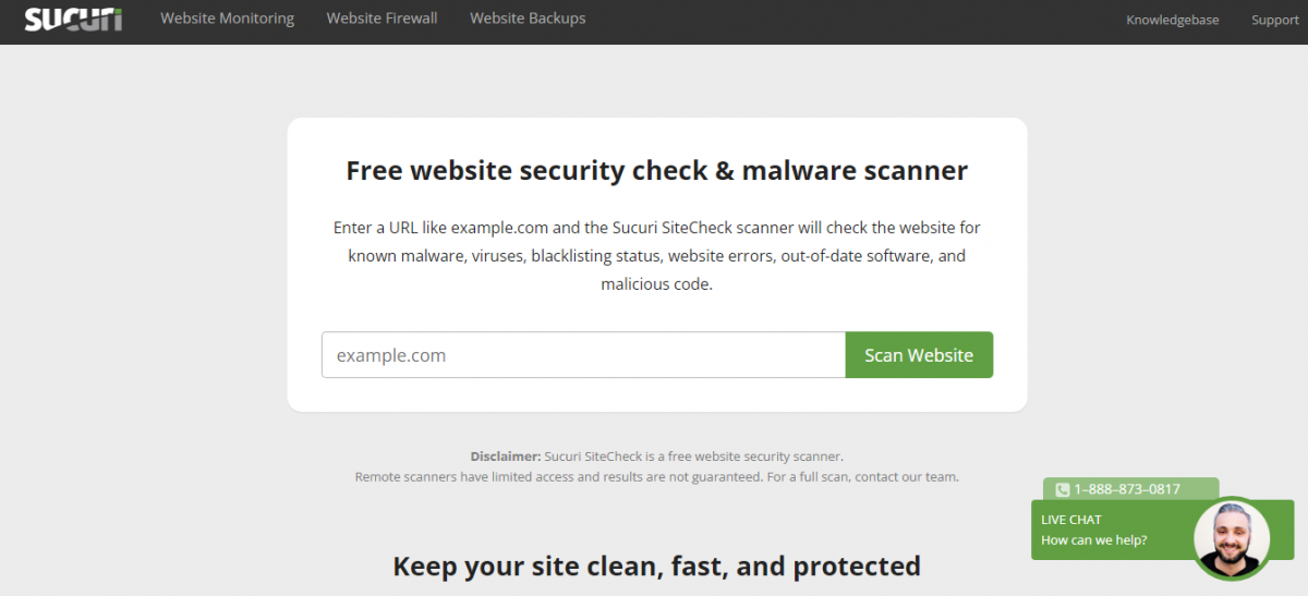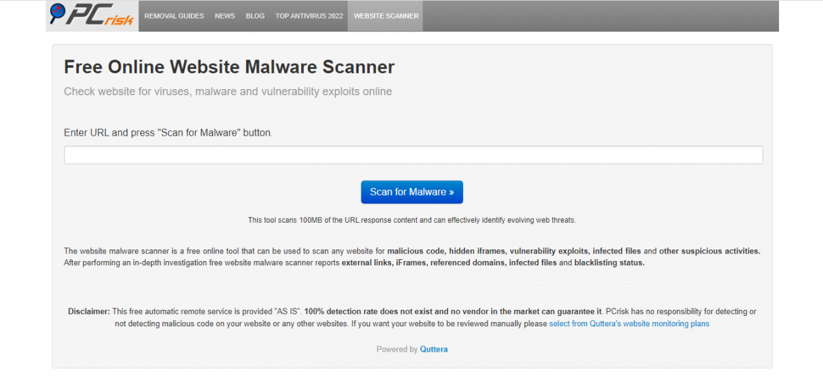 Check for malware and security holes within the site. It is only required to enter the URL in the text box and click on the Scan for Malware button.