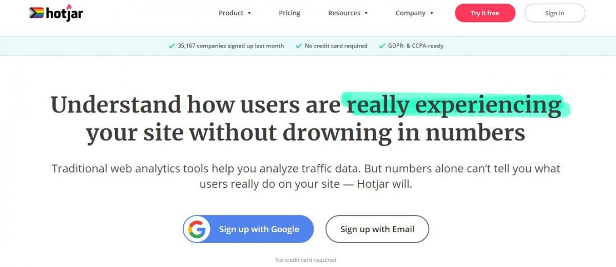 Enter the Hotjar website, www.hotjar.com, and register either with your email or you can use your Google account to apply fewer steps. If you choose to do it with your email, you need to add your username, email, password and accept the terms of use.